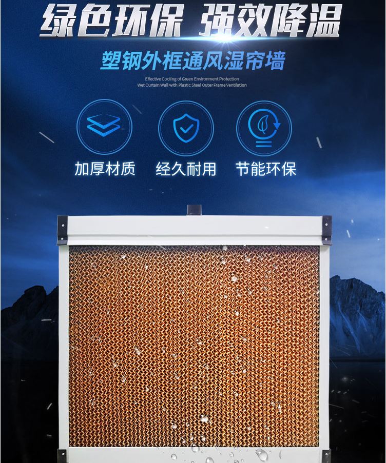 • 水帘系列  【基本介绍】:  材质:塑钢/不锈钢  适用风机:负压风机  产品别名:水帘墙  产品规格:塑钢15cm【厚】,不锈钢10cm【厚】  性能:降温、通风、  用途:工厂仓库养殖场降温
